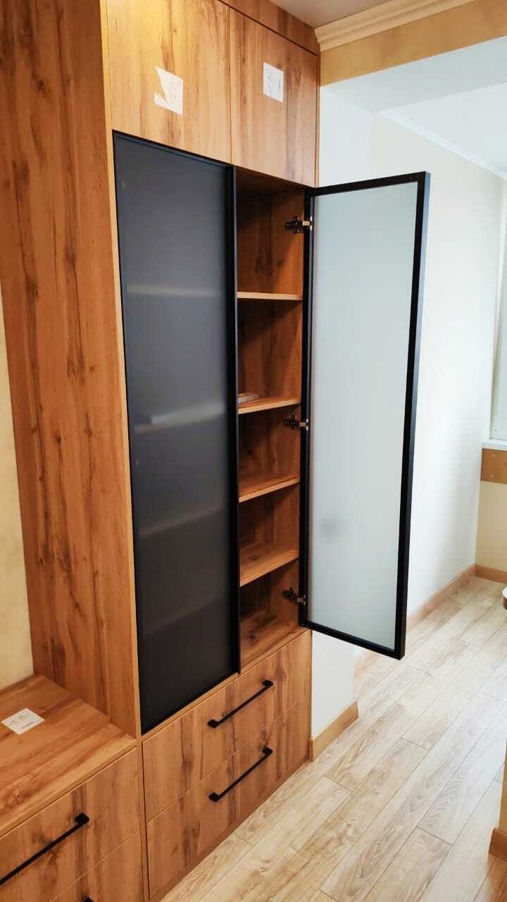 Частично встроенный шкаф-купе с фотопечатью. Базовый материал ЛДСП egger, распашные фасады в алюминиевой раме со стеклянными вставками + фасады МДФ эмаль. Фурнитура GTV